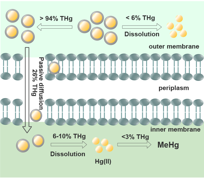 研究以汞甲基化微生物Geobacter sulfurreducens PCA为模型,首先构建与完善了2, 3-二巯基丙磺酸(2,3-dimercapto-1-propanesulfonic acid, DMPS)漂洗去除细胞膜吸附HgSNP的方法,实现了胞内摄入HgSNP的精确定量。然后通过总汞分析、尺寸排阻色谱(size exclusive chromatography, SEC)-电感耦合等离子体质谱(inductively coupled plasma mass spectrometry, ICP-MS)汞形态表征、细胞切片-透射电镜-能谱等分析方法,揭示了细菌对HgSNP的直接摄入过程,发现细菌对HgSNP的摄入量远高于Hg2+-溶解性有机质(dissolved organic matter, DOM)对照组。通过添加ATP合成抑制剂证实了HgSNP的摄入不依赖能量,为被动扩散过程。同时利用SEC-ICP-MS手段揭示了HgSNP的快速胞内溶解过程,这种直接摄入-胞内快速溶解的内化过程类似于真核细胞对人工纳米颗粒摄入的“特洛伊木马”机制。