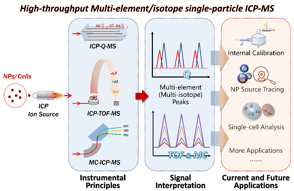 使用ICP-Q-MS、ICP-TOF-MS和MC-ICP-MS检测单个银纳米颗粒和经银暴露的蓝藻细胞上的107Ag和109Ag同位素,将所测同位素比值与天然丰度相比较来定量评估结果的准确性。结果表明,ICP-Q-MS的结果受颗粒/细胞所产生的离子云的持续时间以及驻留时间和稳定时间等多个条件的影响。MC-ICP-MS和ICP-TOF-MS所采集的几乎所有瞬时事件均能同时检测到两种同位素,并且比值的准确性较ICP-Q-MS高。此外,ICP-TOF-MS的通量较高,每秒可检测10~20个颗粒/细胞。值得一提的是,ICP-TOF-MS可在检测Ag的两种同位素的同时监测细胞内源元素,如生物膜和核酸的组成元素P。若检测到Ag峰信号的瞬间同时也检测到P的峰信号,则可认为该信号来自细胞,反之则为游离纳米颗粒。这一信号筛选方法无需任何的标记处理。除了区分细胞与纳米颗粒之外,基于细胞特征性元素指纹完整与否,该方法还可用于例如完整细胞与细胞碎片等的区分,可在很大程度上提高scICP-MS数据的有效性。