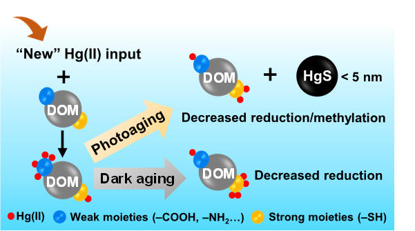 溶解性有机质(DOM)介导的二价汞(Hg(II))老化动力学在控制自然水生环境中Hg(II)的转化和生物有效性方面起着至关重要的作用。然而,‘新’Hg(II)和‘老’Hg(II)在同一反应体系中的环境行为差异尚不清楚。本研究采用多同位素示踪技术探究了同一体系中,DOM介导Hg(II)老化过程中结合位点和硫化作用对Hg(II)还原和微生物甲基化的影响。逐步还原法和液相色谱-电感耦合等离子体质谱(LC-ICP-MS)研究结果表明,DOM介导的暗老化过程主要是由DOM与Hg(II)结合位点的重排驱动的,而非硫化汞纳米颗粒(HgSNP)的生成。随着老化进行,DOM中含量丰富但与Hg(II)作用较弱的羧基和氨基等结合位点逐渐被较强的硫醇等官能团取代,导致Hg(II)的还原能力降低。LC-ICP-MS结果显示,DOM介导的Hg(II)光老化除了影响其还原能力外,还可快速诱导HgSNP的生成(1 h可生成约30.6%的HgSNP),从而大大降低了Hg(II)的微生物甲基化潜能。这些发现有助于更好地理解和预测自然水环境中Hg(II)活性的动力学特征及其对Hg循环的影响。