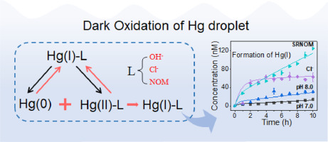 Hg(0)l在水环境中的氧化过程及相关机制尚不清晰。研究首次发现并证实了在Hg(0)l暗氧化过程中,Hg(I)的生成与转化控制了Hg(0)l的氧化进程。使用ACUCHEM软件建立动力学模型,研究发现Hg(0)氧化为Hg(I)的速率常数值((8.7±0.21)× 10-11 s-1)较Hg(I)氧化为Hg(II)((4.7±0.15)× 10-4 s-1)低了7个数量级,Hg(0)氧化为Hg(I)是Hg(0)l氧化进程中的限速步骤。天然水中Cl-、OH-及有机质等环境配体可通过促进归中反应(其速率常数可高达(9.5±0.78)× 10-4 s-1)加速Hg(I)的生成。上述发现有助于更好地理解汞的氧化还原循环过程,并促进对汞地球化学行为的解析。