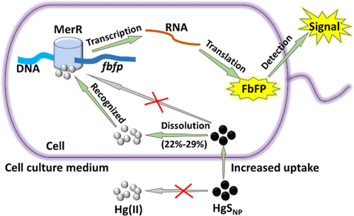 微生物对二价汞(Hg(II))的摄入是汞甲基化或还原的第一步。因此,准确评估汞的生物有效性对于厘清汞的归趋及环境风险至关重要。纳米硫化汞(HgSNPs)广泛存在于各种环境介质中,如缺氧底泥、底泥间隙水、生物膜,以及有氧土壤、天然表层水和废水,可被微生物转化为高毒性甲基汞或挥发性元素汞。但是,如何评估纳米硫化汞的生物有效性仍是我们目前面临的巨大挑战。此外,微生物对纳米硫化汞的吸收利用仅仅反映了其对纳米态和离子态汞的综合效应,仍存在“吸收-溶解”及“溶解-吸收”的争论。针对该科学问题,该研究采用Hg-S-DOM三元体系,合成了粒径为3.17±0.96 nm的纳米硫化汞。以汞诱导型传感器E. coli UCRF和组成型传感器E. coli ACPF为模型微生物,建立了可定量纳米硫化汞生物有效性的分析技术,并考察了细菌对纳米硫化汞的溶解及活化途径。