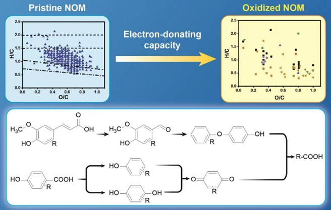 本研究通过FT-ICR MS对酚类模式化合物和NOM样品在直接/媒介电化学氧化(DEO/MEO)中的氧化产物进行鉴定,探讨了酚类结构产生EDC的主要MTPs。研究发现,除了氢醌向醌的转化外,新生酚羟基(ArOH)的氧化和酚氧自由基的氧化交联反应是直接产生EDC的主要MTPs。特别是,发生氧化偶联反应的ArOH至少可贡献22-42%的EDC。值得注意的是,NOM中类阿魏酸结构可通过丙烯酸取代基与H2O的加成反应直接提供EDC。此外,开环反应通过改变NOM的结构间接削弱EDC;脱羧可减弱或增强EDC,这取决于NOM中酚类基团的结构。这些结果表明,NOM的EDC是其酚类结构多个MTPs的综合结果,不仅涉及ArOH的氧化,还涉及H2O与烯烃键的加成反应和一系列的断键反应。