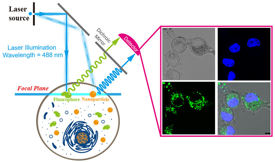 纳米材料在众多领域,特别是生命科学和医学领域得到广泛应用,其环境与健康风险备受关注。实时观察纳米颗粒的细胞摄入、胞内分布以及转化过程,对于深入了解和准确把握纳米颗粒的生物学特性及其安全性评价具有重要意义。对于非标记的纳米颗粒,现有的技术手段,如电子显微镜和暗场显微镜,均不能做到长时间的实时观察,特别是不能实现对纳米颗粒和生物分子的同时示踪观测。针对该科学问题,本组开发了一种基于共聚焦显微镜的散射光成像新技术,实现了对活细胞内非标记纳米颗粒和荧光标记生物分子的同时成像。