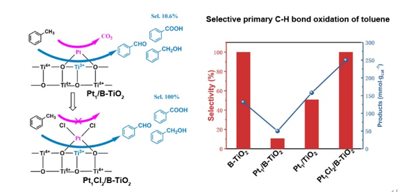 理论计算表明,Pt/TiO2催化剂的Ti3+是甲苯的甲基C–H键选择性氧化的活性位点,而Pt是甲苯过氧化的活性位点。常规合成的Pt/TiO2单原子催化剂具有典型的Pt-O二配位结构,有趣地是,四配位的Pt位点不会活化氧分子导致甲苯过氧化。在此基础上,我们利用还原TiO2为载体,氯铂酸(H2PtCl6)的水溶液为Pt前驱体,合成了Pt/B-TiO2催化剂。由于Pt与还原TiO2的电子相互作用较弱,电子从Pt向Cl配位转移形成稳定的Pt-Cl键。Cl配位使得Pt二配位结构转化为四配位结构(图1),在洗涤和焙烧处理后Pt-Cl键仍然稳定存在,抑制了Pt位点的甲苯过氧化活性。与此同时,富电子的Pt原子有利于Ti3+的稳定,进一步提升了甲苯的选择氧化效率。该方法有效调控了TiO2负载Pt催化剂的选择性,对甲苯的甲基C–H键氧化的选择性可以达到100%。