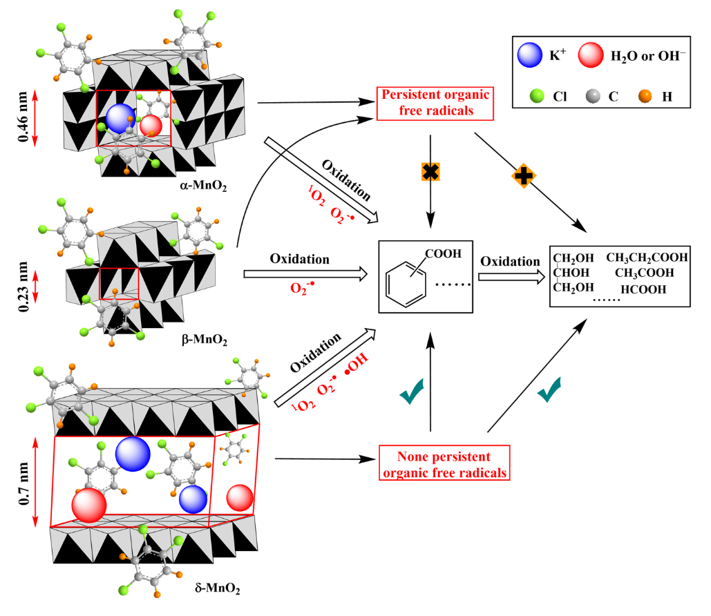 目前,常规/持久性自由基对钾离子调控的MnO2隧道结构催化活性的作用研究较少。因此,我们合成了三种不同晶型的MnO2催化剂(α-、β-和δ-MnO2),并在300 °C下开展了对1,2,4-三氯苯的催化降解研究。结果表明δ-MnO2能够通过K+的调控形成二维的层状孔道结构,并在三种MnO2晶型催化降解1,2,4-三氯苯中表现出了最好的催化活性。电子自旋共振表征和能量势垒理论计算结果均证实在三种MnO2催化剂中,δ-MnO2拥有最丰富的活性氧物种:O2−•、•OH和1O2,其次是α-MnO2,它含有O2−•和1O2活性氧物种,而β-MnO2拥有活性氧物种最少,仅有O2−•。此外,在α-和β-MnO2/1,2,4-三氯苯的催化体系中,检出了明显的持久性自由基信号,而在δ-MnO2/1,2,4-三氯苯催化体系中并无持久性自由基信号产生。这可能是导致三种MnO2催化氧化活性差异的原因。在氧化过程中,1,2,4-三氯苯首先被活性氧物种攻击,生成苯甲酸和丙三醇等中间产物,随后被进一步氧化生成小分子物种,如甲酸、乙酸、丙酸和丁酸等。本研究结果使我们更深入地了解了自由基在氯化芳烃催化降解中的作用。