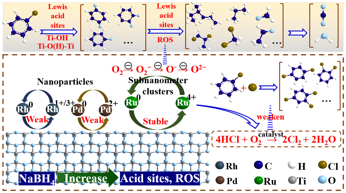 CVOCs催化燃烧的工业应用因氯中毒引起的催化剂失活和多氯联苯副产物的产生而受到阻碍,开发稳定且低副产物生成的新型催化材料至关重要。Ru因具有高的Deacon反应活性可有效将氯物种转化为Cl2,实现氯物种从催化剂表面脱附,但金属-载体相互作用尚未得到深入研究。考虑到特定晶面暴露的载体具有已知的表面几何结构、配位状态和表面能,这有利于提高理论计算的准确性,并进一步促进对金属-载体相互作用的深入探究。本研究成功合成了{001}晶面TiO2,通过NaBH4还原浸渍法将Ru、Pd、Rh分别负载于{001}晶面TiO2载体上用于热催化降解氯苯。Ru/{001}-TiO2表现出优异的氯苯降解活性、CO2选择性及稳定性,可在250℃实现氯苯完全降解,且产生最少的多氯副产物。NaBH4可增强{001}-TiO2的Lewis酸位点、超氧自由基和表面羟基物种。然而,仅增强催化材料的活性位点对于氯苯催化降解是不够的,有效的氯物种脱附以防止催化材料发生氯中毒以及持续不断的产生反应性活性氧物种来促进氯苯及降解中间产物的深度氧化也是设计氯苯催化材料的关键。该核心问题被Ru0Ru4+循环有效解决。整个过程遵循Mars and Van Krevilen机制。NaBH4增强的活性位点和亚纳米级Ru0Ru4+循环协同作用实现了有效且可持续的氯苯催化氧化。本研究评价出了可高效降解二恶英类氯代芳烃污染物的晶面调控纳米材料。为无意产生的持久性有机污染物的污染治理和环境修复技术的发展和应用提供理论借鉴。