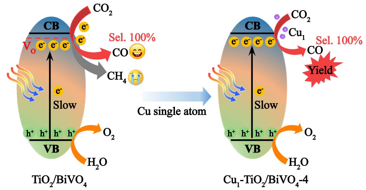 图1 异质结耦合单原子同步提高光催化CO2还原产物CO选择性和产率的机制示意图。