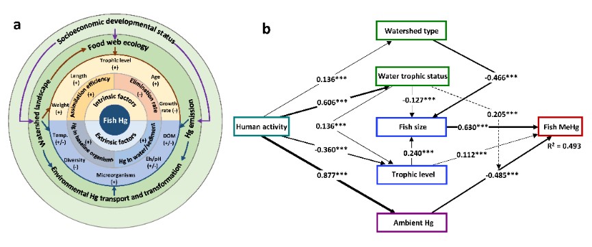 研究团队分析了全球 315 个水生系统的鱼汞特征,发现鱼类总汞和甲基汞浓度在不同国家/区域间存在显著的地理差异。进一步以中国和美国为例进行对比研究,发现尽管中国的汞排放较高,但其鱼类总汞和甲基汞水平却远低于美国。为厘清驱动鱼汞累积的关键因素,该团队运用结构方程模型将鱼类甲基汞的地理差异与人为活动、环境汞浓度、食物网结构和流域特征相关联。结果显示,人为活动通过加剧环境汞浓度和水体富营养化,以及/或改变鱼类性状来影响鱼类甲基汞浓度水平。其中,鱼类大小是最具影响力的直接因素,正向影响鱼类甲基汞累积,其次是鱼类营养级(图1b)。但过度捕捞等人为活动会降低鱼类大小和营养级、缩短食物链及鱼类寿命,从而降低鱼类甲基汞累积。这也是中国鱼类甲基汞浓度水平较低的关键因素。