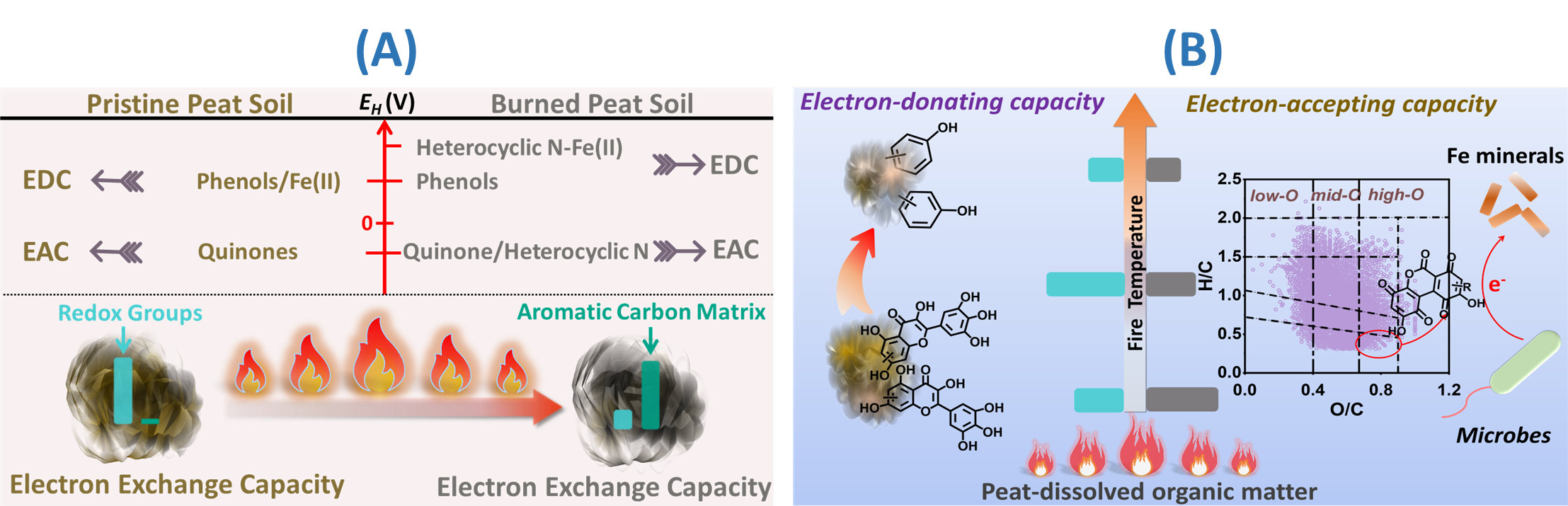 泥炭地以土壤有机质形式累积了1/3的全球土壤碳。这些丰富的泥炭土壤有机质(PSOM)具有强的电子传递能力,可通过调节微生物呼吸的电子受体有效性,在泥炭地甲烷排放及铁循环等众多生物地球化学过程中发挥重要作用。然而,全球气温升高和干旱趋势加剧,导致全球8%的泥炭地受到野火侵袭,其火灾面积高达全球野火总面积的近一半。这些增加的火灾显著改变了PSOM的结构组成,可能改变其电子传递能力,进而影响火后泥炭地的生物地球化学过程。目前,火灾诱导的PSOM电子传递特性和相关电活性结构的变化尚不明确,阻碍了对火灾后生物地球化学过程的理解。
